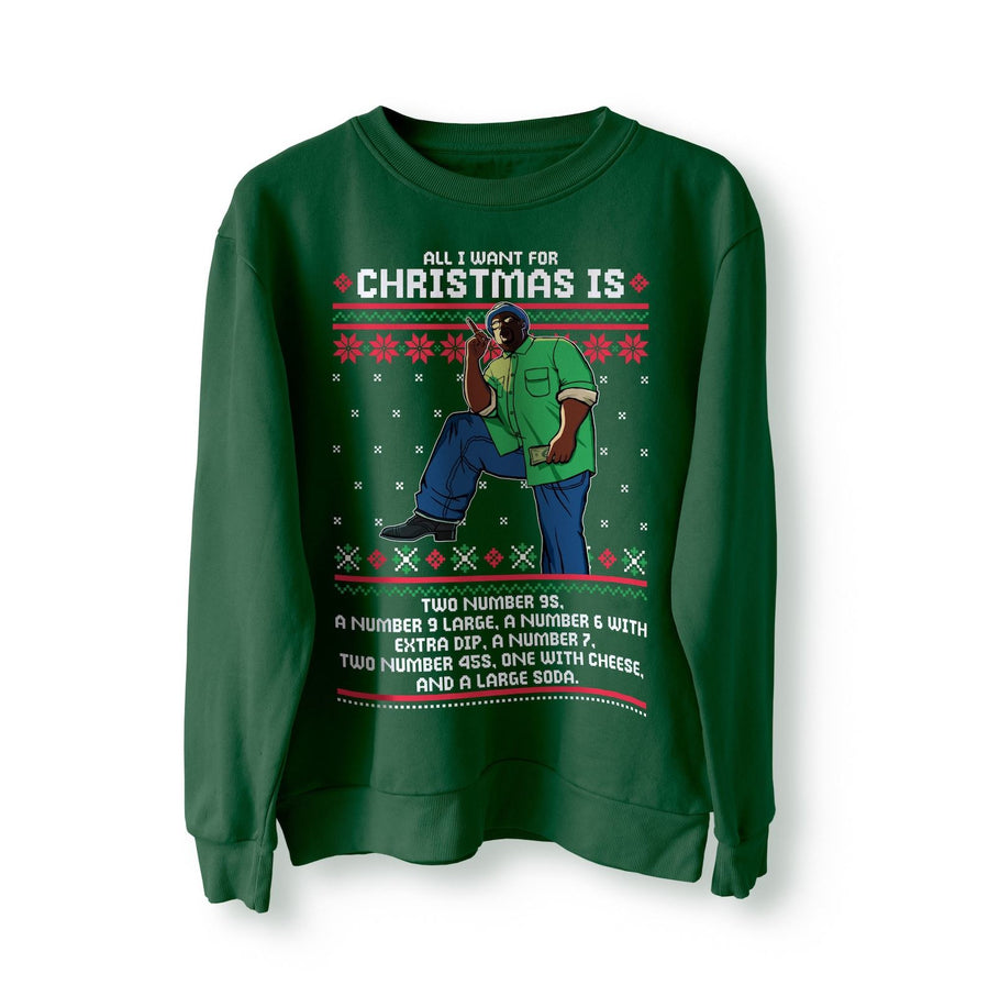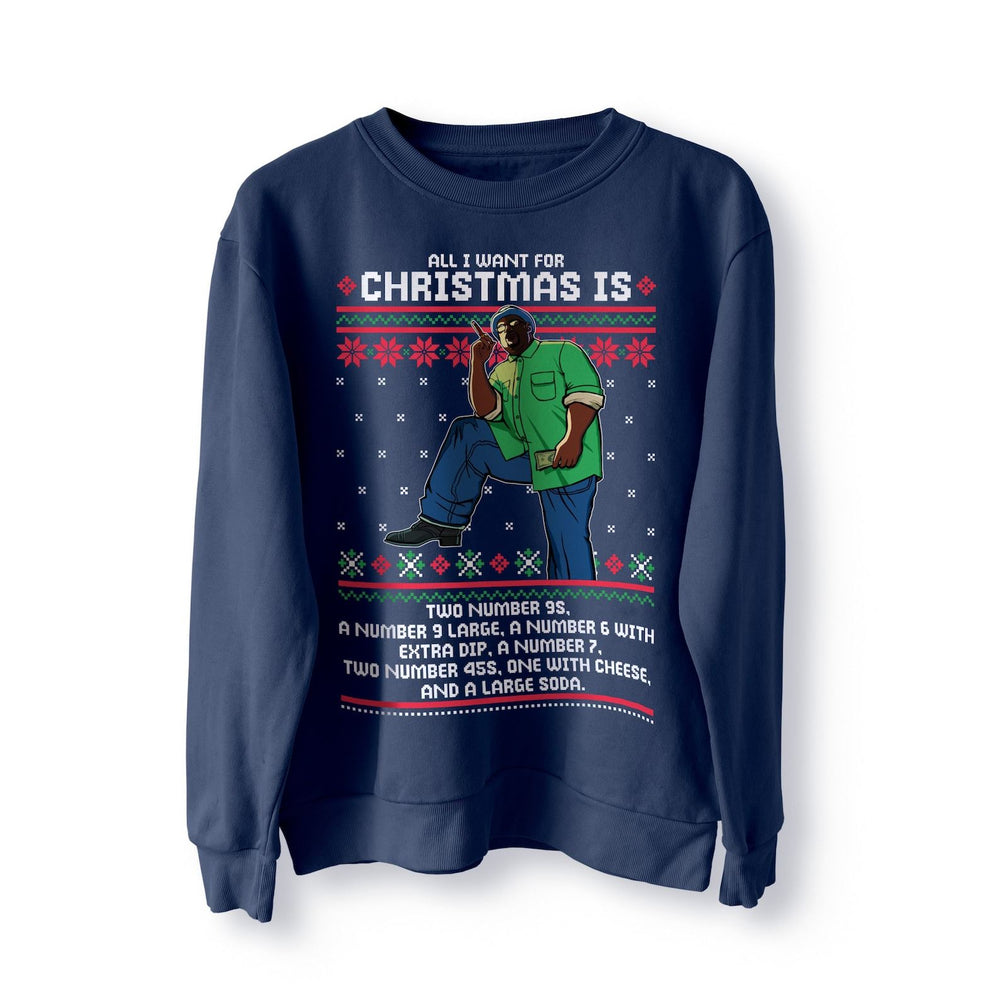 Dive into the holiday season with a unique gaming twist with our Big Smoke Funny Christmas Jumper, inspired by the iconic character from Grand Theft Auto San Andreas. This cleverly designed jumper features Big Smoke's legendary order: two number 9s, a number 9 large, a number 6 with extra dip, a number 7, two number 45s, one with cheese, and a large soda. It's the perfect Christmas garment for gamers and fans of the GTA series. This festive top not only showcases your love for the classic game but also adds a humorous touch to your holiday wardrobe. Ideal for Christmas parties, casual gaming sessions, or as a funny gift for fellow GTA enthusiasts, this Christmas gamer sweatshirt is a fun and unique way to celebrate the season. Grab yours and pay homage to one of gaming's most memorable moments while enjoying the holiday festivities!