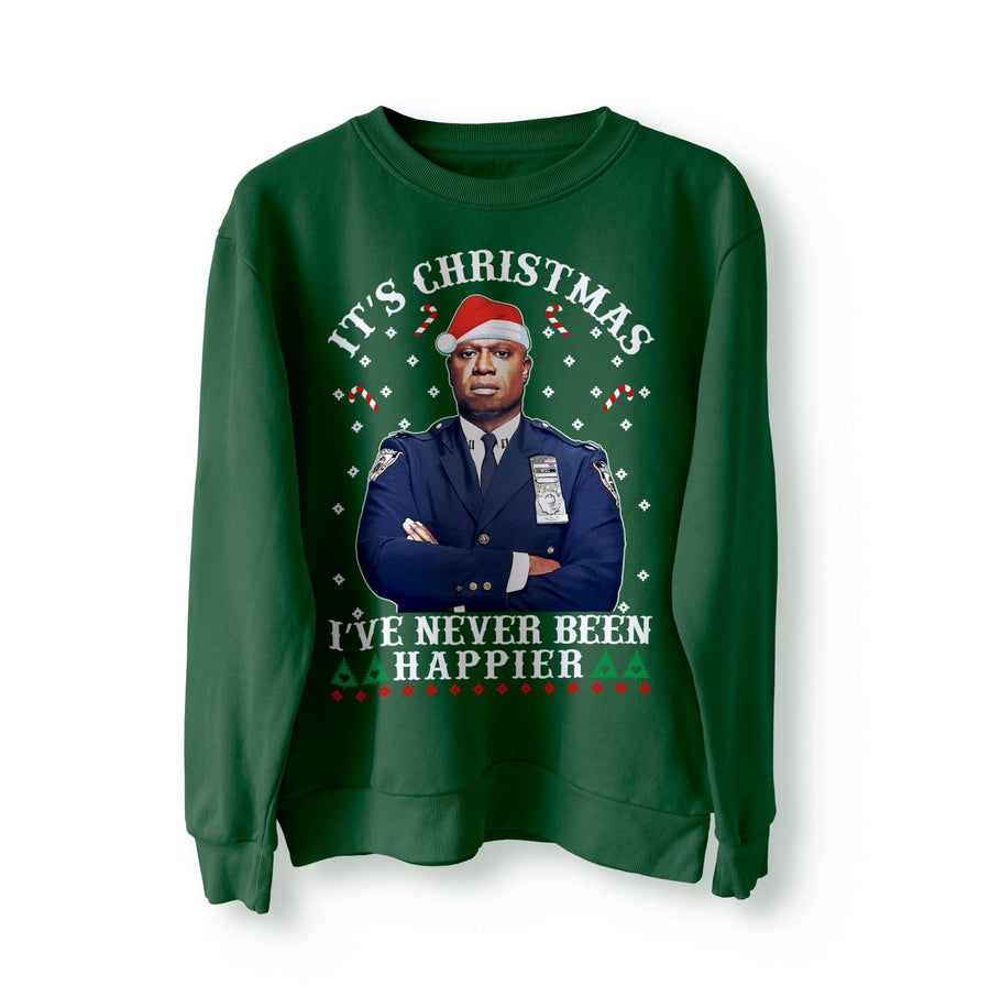 Get into the festive spirit with our Captain Raymond Holt Funny Christmas Jumper, an ideal pick for fans of the hit TV show Brooklyn 99. This cosy and humorous sweater features the iconic phrase 'I've never been happier' from Captain Raymond Holt, making it a perfect funny Christmas top. Whether you're looking for a unique Christmas gift or just want to show off your love for the show, this jumper is an excellent choice. It's the ideal way to celebrate the season and show your appreciation for one of TV's most memorable characters. Shop now for this must-have Xmas top, a hilarious and comfortable addition to your holiday wardrobe or as a funny gift for the Brooklyn 99 fan in your life!
