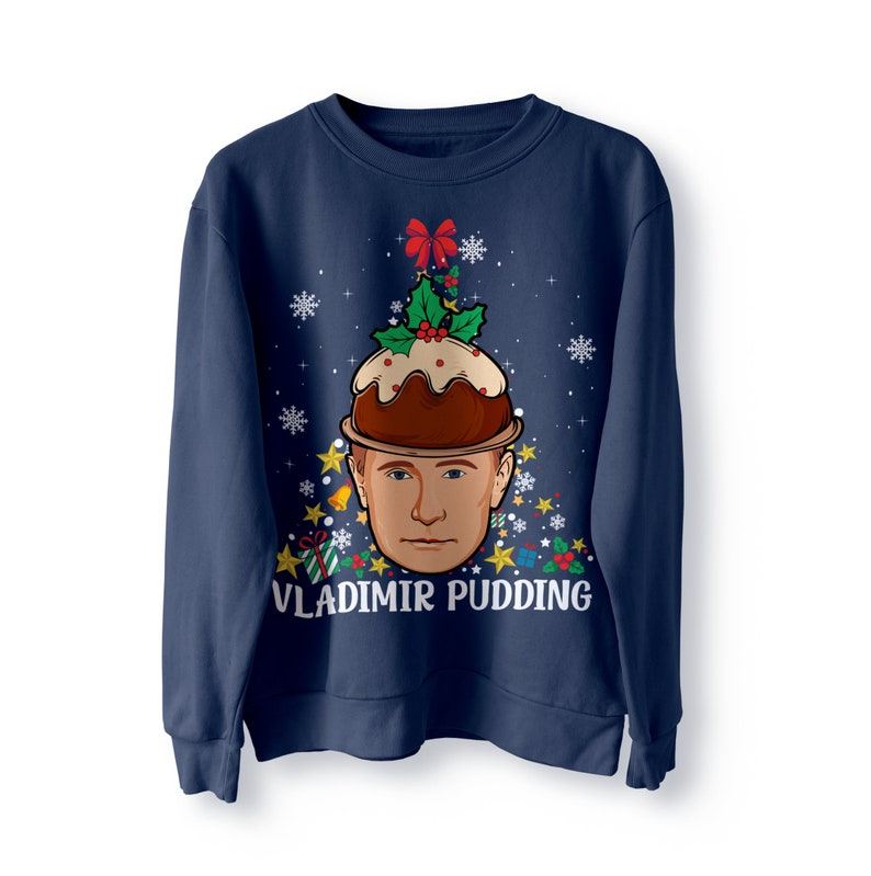 Get into the festive spirit with our Vladimir Putin Funny Christmas Jumper. This cosy and humorous sweater features the an illustration of a cartoon Vladimir Putin morphed into a Christmas Pudding in a Christmas Tree shape, making it a perfect funny Christmas top. Whether you're looking for a unique Christmas gift or just want to show off your funny humour, this jumper is an excellent choice. It's the ideal way to celebrate the season. Shop now for this must-have Xmas top, a hilarious and comfortable addition to your holiday wardrobe or as a funny gift!